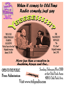 278 | 2/19/17 | Those Thrilling Days of Yesteryear THE LUCKY STRIKE PROGRAM STARRING JACK BENNY: On the Train to New York THE MAGNIFICENT MONTAGUE: The PTA Show ![]() | Director/Transcriber |